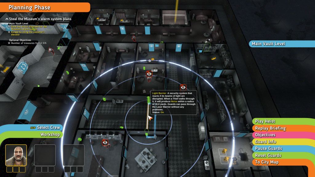 The missions start out straightforward, where you just have to open doors and avoid cameras and guards, but then they slowly get more and more complex, and you have to coordinate what your crooks are doing. For example, early on you might only need to have your locksmith pick open a door to go through, but then later you might need to toggle laser barriers on and off to create a route to the door, or hit a timer switch that only opens the door for a few seconds. You’re allowed to queue up commands for your crooks (including a “wait” command), and you’re also allowed to pause the game and issue commands, so coordinating your crooks is straightforward.
