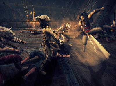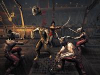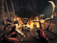 “You will die.” Thanks to the near constant state of survival, the prince has developed many more attacks and maneuvers to quickly and brutally dispatch opponents that cross his path. While there are still a number of acrobatic and evasive moves that the Prince can pull off from enemy to enemy, he now places much more of a premium on combos. These are highly dependent upon whether he’s wielding one or two weapons at one time. If he’s holding one sword, he’ll have the ability to grab opponents, performing throws, close range attacks and even strangulations. If the Prince picks up a second weapon, he loses the ability to grapple foes, but he’ll double his damage potential, creating a number of destructive one-two hits with both hands. These secondary items will degrade over time, however, forcing you to discard them or throw them at enemies as a set up for other attacks. Regardless of the choice or number of weapons in your hands, the Prince will perform a number of deadly blows, including decapitations, impalements and completely hacking targets in two in graphic detail. Considering that you’ll often be surrounded by 4 or more opponents at a time, it’s possible to cut a large bloody swath through your foes with effective strikes.
