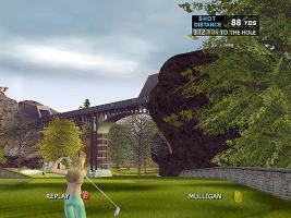Indeed, you’d probably expect to see most of these people in an x-rated version of Caddyshack than on an actual course. But the courses of Outlaw Golf themselves have a personality of their own, adding to the spirit of the title. Three courses are available for play, along with a driving range that offers mini-games to help you practice your distance and accuracy. The first course, the Turnpike Valley Country Club, is set in Jersey amidst multiple highway overpasses, pipelines, and other industrial hazards. Not only will you have to worry about the sand and water traps, but also bridges and planes flying so low you’ll swear you’d could cause a crash with a perfectly aimed ball. The second course, the Crusty Leaf Country Club, looks much more like a normal course, but has tons of trees to block your way and large fairways at tricky angles to catch your ball on. Finally, the El Diablo Country Club makes the Outback look like a miniature golf course. With naturally occurring cliffs, rock outcroppings and tall hills, you’ll really be put to the test here.